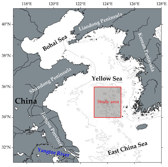 Topography of the Yellow Sea. The gray solid lines represent isobaths (in meters), and the shaded area indicates the study region (34–36°N, 123–125°E).