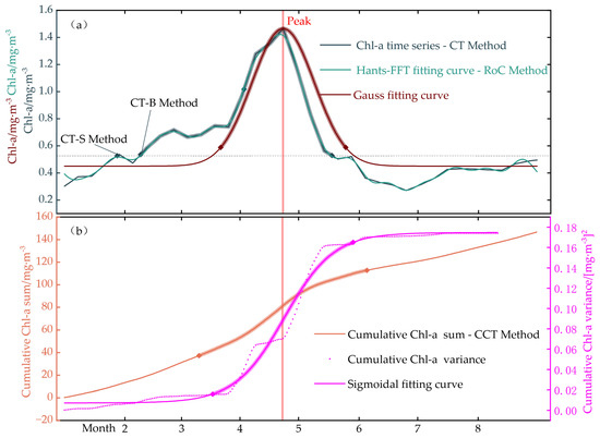The calculated results of bloom initiation are presented, with diamonds indicating the initiation and termination of blooms; the shaded area between markers represents bloom duration. (a) The CT, RoC, and Gauss fitting method and (b) the CCT method and sigmoidal fitting method. The gray dashed line in (a) denotes the threshold value established by the CT Method.