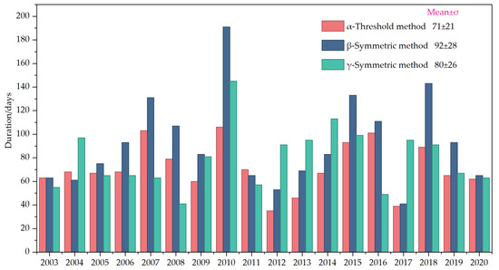 Duration calculations revealed a strong correlation between threshold and symmetric methods (r = 0.87) when using identical initiation inputs. However, the threshold method demonstrated superior temporal stability, exhibiting a 17-day lower standard deviation (σ). The duration calculated using the threshold method was the shortest, averaging 70 days, while the symmetric method yielded durations that were, on average, more than 10 days longer than those derived from the threshold method.