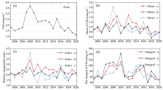 Bloom intensities of the spring bloom in the central Yellow Sea calculated by the four methods. Subfigures (a–d) correspond to the Peak, Mean, Index, and Integral Methods, respectively. Additionally, α, β, and γ denote the duration metrics specified in Figure 4 that are employed for the intensity calculations. Durations α and β were calculated using initiation data from the CT-B method, whereas duration γ was calculated using initiation data from the CCT-X method.
