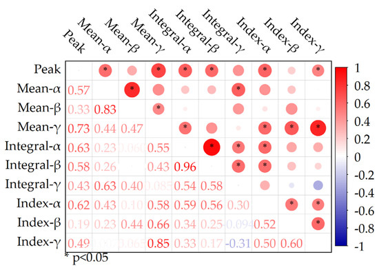 Correlation analysis revealed relationships among various methods (Figure 6). The Peak Method demonstrated significant correlations with the Mean Method, Integral Method, and Index Method when using durations derived from the threshold method (α in Figure 4) (r > 0.5, p < 0.05). Additionally, the Integral Method and Index Method exhibited a strong positive correlation (r > 0.5, p < 0.05). In contrast, for durations calculated using the symmetric method (β in Figure 4), only the Integral Method and Peak Method maintained a significant correlation (r = 0.58, p < 0.05). Notably, when employing durations derived from the symmetric method (γ in Figure 4), the Mean Method and Index Method displayed particularly strong correlation (r = 0.85, p < 0.05), but no correlation for other durations. Overall, for varying duration inputs, intensity values derived from the same calculation method usually showed high correlation; for example, the three results obtained from the Integral Method demonstrated significant positive correlations with each other (all r > 0.5, p < 0.05). However, the correlations between different methods were weak and non-significant, suggesting that different methods may capture different interannual variations in spring bloom intensity.