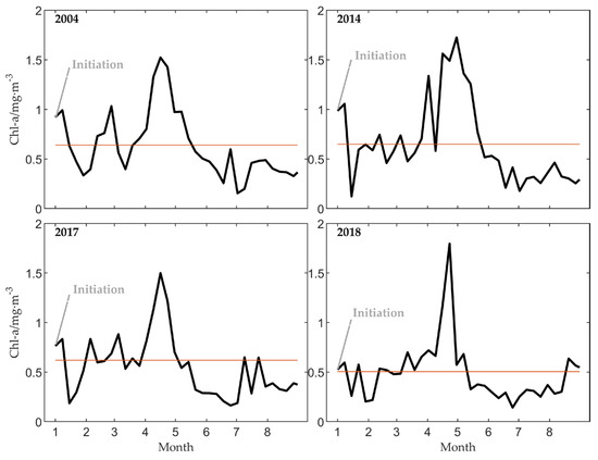 Time series of Chl-a in the central Yellow Sea from January to August in 2004, 2014, 2017, and 2018. The red solid line indicates the concentration threshold. The gray font indicates the initiation of spring blooms in winter diagnosed by the CT method for the corresponding years in Table 2.
