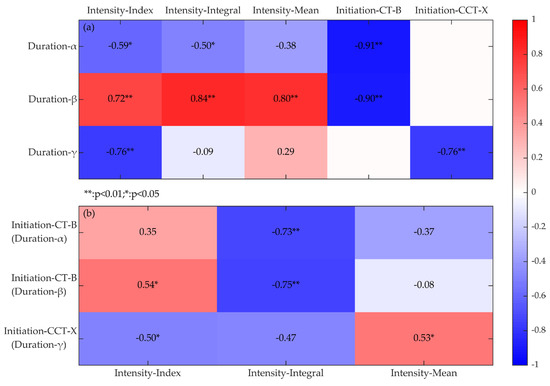 The intrinsic definition of bloom duration as the interval between initiation and termination establishes a fundamental interdependence with initiation. Correlation analyses (Figure 8a) reveal significant negative correlations between initiation and duration across all methods (threshold method with CT-derived initiation [α]: r = −0.91; symmetric method with CT-derived initiation [β]: r = −0.90; symmetric method with CCT-derived initiation [γ]: r = −0.76; all p < 0.01), confirming that earlier initiation is consistently associated with extended bloom durations.