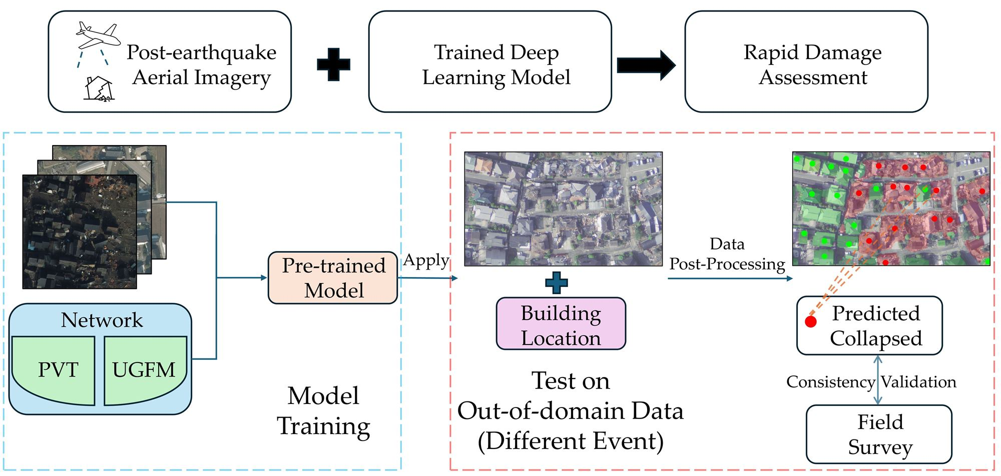 - In real-world post-earthquake scenarios, there is often no time to manually annotate new datasets, making it infeasible to create labeled data for each event. As a result, models must rely on training from previously available data and be directly applied to unseen scenarios. However, due to the scarcity of post-earthquake RS data, such models are prone to overfitting to the training domain, which limits their generalizability. Although this study introduced the UGFM to enhance model transferability, it is fundamentally still reliant on previously labeled data. The semi-supervised learning techniques could be incorporated, i.e., where the model automatically generates pseudo-labels during inference, which may furthermore improve the model’s adaptability to new disasters without requiring manual annotations.