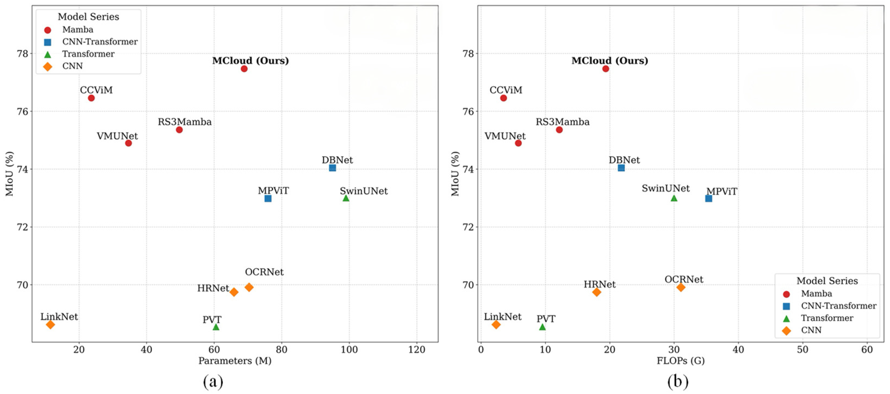 - Convolutional Branch + VSSM Branch + MC Module: With the further addition of the MC module, the MIoU increased to 78.19%, an improvement of 1.89% and MPA increased. The MC module integrates the global features from the VSSM branch and the local features from the convolutional branch, enabling cross-scale feature interaction. This further enhances feature representation and strengthens the model’s ability to interpret complex cloud and cloud shadow features.
