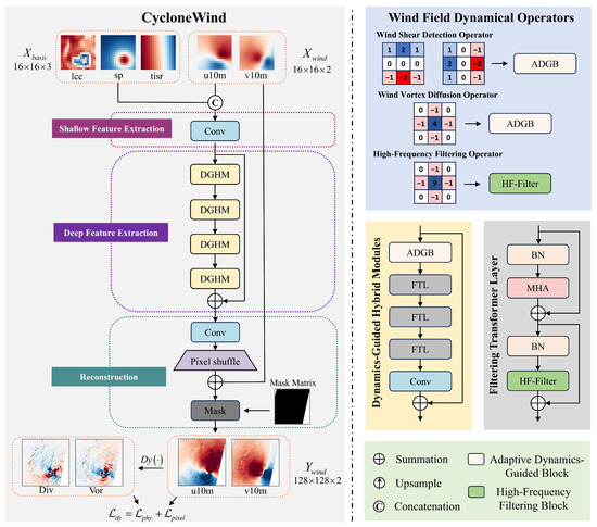 (2) In our CycloneWind, we propose ADGBs to explicitly encode wind shear intensity and wind field rotational dynamics through synergistic integration of the wind shear detection operator and wind vortex diffusion operator. Then, we design FTLs by replacing SwinIR MLP blocks with high-frequency filtering operators alongside convolutional layers. Leveraging divergence and vorticity properties of TC wind fields, we formulate a divergence–vorticity composite loss function to enforce dynamical consistency in reconstruction.