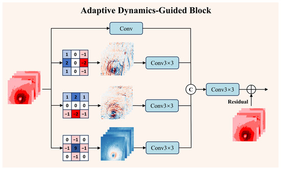 Wind shear and turbulent kinetic energy diffusion represent key kinematic characteristics governing tropical cyclone (TC) intensity evolution and structural organization. These observable features are valuable for detecting structural asymmetries, rainbands, eyewall boundaries, and environmental interaction zones. Specifically, fine-scale analysis of horizontal wind shear structures in the TC periphery enables the detection of circulation boundaries and potential outer rainbands. Concurrently, spatial distributions of wind vortex diffusion coefficients quantify turbulent mixing intensity, serving as effective indicators for precisely delineating typhoon eye boundaries. To explicitly incorporate these dynamical constraints within the downscaling framework, we introduce ADGBs as illustrated in Figure 2. These blocks are augmented with two specialized operators: the wind shear detection operator extracts zonal and meridional gradient variations to capture divergence and vorticity signatures, and the wind vortex diffusion operator targets high-frequency central regions characterized. Together, they form an adaptive feature extraction and fusion mechanism that dynamically integrates these wind field characteristics to selectively reinforce dynamical consistency within the main network’s predictions. Mathematically, this fusion process is expressed as