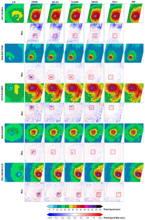 Wind field downscaling represents a critical component of meteorological downscaling research [20,21,22,23]. Relative to parameters such as temperature and salinity, near-surface wind fields exhibit stronger spatiotemporal variability and more complex local forcing responses. These characteristics significantly increase downscaling uncertainty and necessitate models with enhanced representational capacity. To address the dynamic influence of complex terrain, researchers have developed modules integrating terrain features to enhance downscaling accuracy. For instance, Zhong et al. [24] employed a UFormer architecture incorporating a dedicated HR terrain data encoder. Yu et al. [25] proposed a terrain-guided flat memory network and design an enhanced terrain-guided loss function utilizing HR remote sensing data. Sekiyama et al. [26] introduced an SRCNN variant featuring separate encoders for wind and terrain data, employing ensemble models trained with varying random seeds for kilometer-scale downscaling across Japan’s main island region. Subsequently, Lian et al. [27] developed the TerraWind model, which combines terrain factors and station-to-station relationships to capture multiscale wind–terrain correlations. Concurrently, other studies have explored efficient modules and innovative model architectures. For example, Liu et al. [28] enhanced multiscale feature fusion by introducing a dual-cross-attention mechanism within a UNet architecture. Mardani et al. [29] applied generative diffusion models, combining UNet mean prediction with diffusion models’ residual correction to achieve 2 km scale downscaling throughout the Taiwan region. These approaches primarily target either background wind fields or general weather systems over land under complex terrain conditions. Conversely, research addressing marine wind fields, especially extreme wind fields associated with strong weather systems, remains relatively limited. This limitation impedes understanding and prediction of TC wind field characteristics in critical air–sea interaction zones.