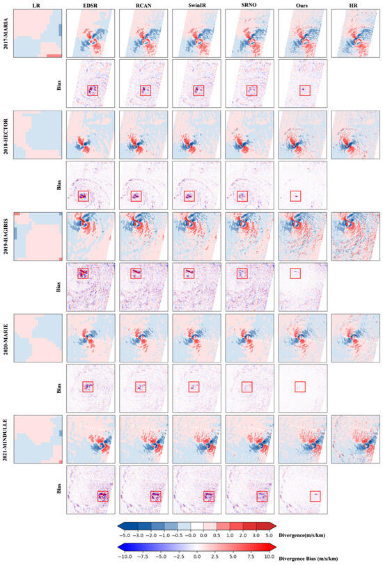 Diagnostic comparison and error distribution of downscaled TC divergence fields between downscaling results and ground truth. Red frames highlight regions of substantial inter-model error differences.