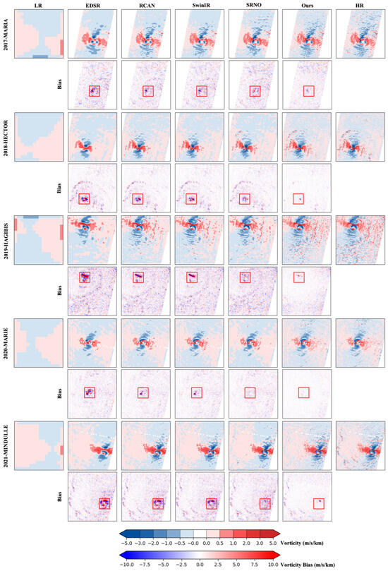 Diagnostic comparison and error distribution of downscaled TC vorticity fields between downscaling results and ground truth. Red frames highlight regions of substantial inter-model error differences.