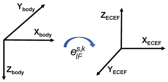 where denotes the center-of-mass position vector of the ground antenna; denotes the PCO vector of the ground receiver, defined from the receiver’s center of mass to the antenna phase center; denote the center-of-mass position vector for the satellite; denotes the PCO vector of the satellite in the earth-fixed system; denotes the satellite PCO vector in the satellite-fixed coordinate systems, which can be shown in Figure 2; is the rotation matrix from the spacecraft body-fixed system to the earth-fixed system, which is determined by the satellite attitude control mode. The attitude model of BDS satellites follows the definition provided in the BeiDou Signal-in-Space Interface Control Documentd []. All LEO satellites used in this study are assumed to be three-axis stabilized, which is consistent with the configuration of most LEO satellites deployed for navigation or Earth observation missions.