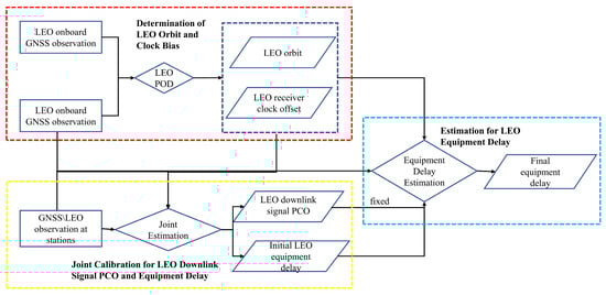 Based on the above analysis, we establish a joint estimation framework for the downlink antenna phase center offset (PCO) and equipment delay of LEO constellation satellites. The overall workflow, as illustrated in Figure 3, consists of the following three main steps: