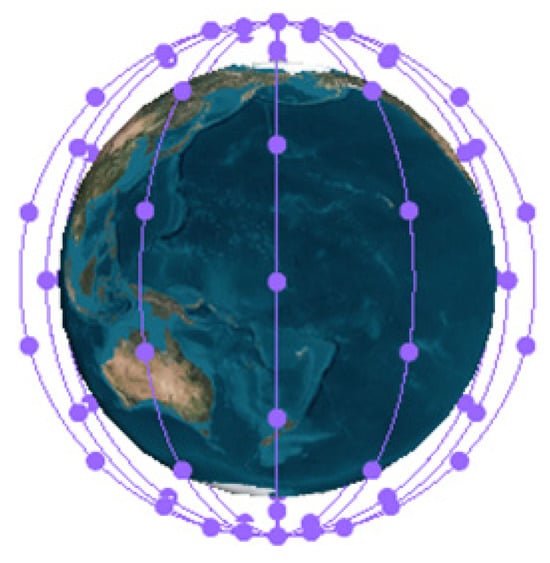 Figure 4 illustrates the configuration of the simulated Scheme A LEO constellation. In this simulation, a polar LEO constellation is configured with 144 satellites evenly distributed across 6 orbital planes, with an approximate altitude of 1000 km. The LEO satellites are numbered sequentially as L01, L02, …, L144. For GNSS reference, the BDS-3 (BeiDou-3) constellation is adopted in the joint simulation and evaluation.