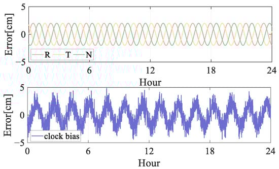 To better approximate real-world conditions, this study adopts a realistic error modeling approach for the simulated LEO satellite orbits and clock biases. Orbital errors in LEO satellites are typically characterized by distinct periodic patterns, primarily resulting from imperfections in the dynamic force models, such as atmospheric drag and solar radiation pressure. In contrast, clock errors arise from a combination of systematic periodic variations (e.g., thermal drift or orbit-dependent effects) and stochastic noise introduced by the onboard oscillator. Accordingly, the orbital errors are modeled using deterministic periodic functions (e.g., cosine terms), while the clock errors are represented as a superposition of periodic components and Gaussian white noise []. This composite modeling strategy ensures a more faithful representation of orbit and clock bias behaviors, thereby enhancing the reliability of simulation-based performance evaluations. Figure 5 illustrates a representative example of the simulated orbit and clock bias errors.