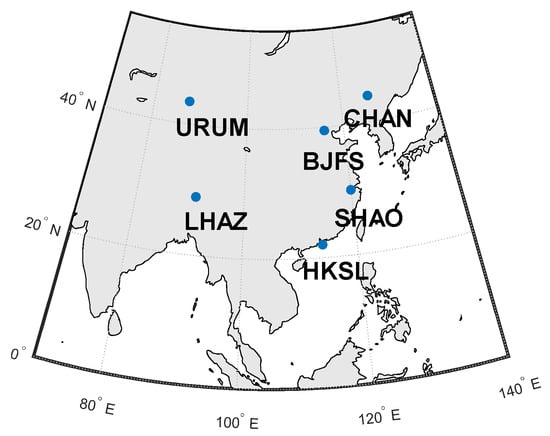 In the initial stages of the development of the LEO satellite navigation system, it is conservatively estimated that the number of ground stations capable of tracking its navigation signals will be severely limited. This requires taking into account the scenario where global station deployment is not feasible and the number of available monitoring stations is scarce. Therefore, six network stations located in China are selected to simulate GPS and LEO observation shown in Figure 6, which are SHAO, URUM, CHAN, LHAZ, BJFS, and HKSL, respectively.
