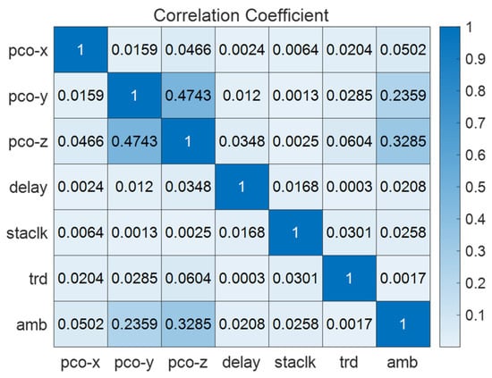 Correlation between the parameters of one LEO satellite. (pco-x, pco-y, and pco-z represent three directions of the downlink signal PCO of LEO satellites respectively; delay indicates the equipment delay of LEO satellites; staclk and trd represent station clock error and tropospheric delay parameters; amb represents the LEO satellite ambiguity parameter).