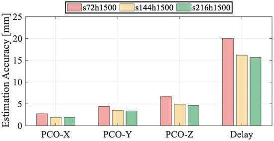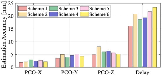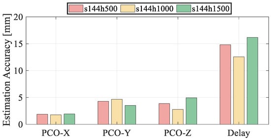 Under a fixed constellation size, the impact of orbital altitude on the estimation accuracy of LEO downlink signal PCO and equipment delay is primarily reflected in two aspects: higher orbital altitudes result in more visible LEO satellites for ground stations, whereas lower altitudes lead to faster relative motion between satellites and the ground, enhancing the geometric variation but reducing the number of visible satellites. To investigate these effects systematically, three representative polar-orbit constellation schemes A, B, and C were selected, with orbital altitudes of 500 km, 1000 km, and 1500 km, respectively, and all containing 144 satellites. Figure 9 illustrates the estimation accuracy of PCO and equipment delay under LEO constellations with identical scale but different orbital altitudes. The corresponding statistical results are summarized in Table 6. The results show that the estimation accuracy in the X-direction is consistently higher than that in the Y and Z directions, with values better than 2 mm and relatively insensitive to changes in orbital height. This may be attributed to the alignment of the X-direction with the satellite velocity vector, which leads to faster changes in the corresponding partial derivatives in the design matrix and improves estimation sensitivity. In contrast, the Y and Z directions exhibit greater sensitivity to orbital altitude. At 500 km, the estimation accuracies of Y and Z directions are nearly equal; at 1000 km, the Y-direction performs worse than Z; while at 1500 km, the Z-direction accuracy deteriorates significantly. Regarding equipment delay, the best estimation accuracy is achieved at 1000 km, followed by 500 km, with the poorest performance at 1500 km. Nevertheless, all three configurations maintain equipment delay accuracy within 2 cm. Overall, these results confirm that orbital altitude has a significant impact on the estimation accuracy of LEO downlink PCO and equipment delay, through its influence on satellite visibility and geometric variation. Therefore, both factors should be carefully considered in constellation design and system implementation to optimize estimation performance.