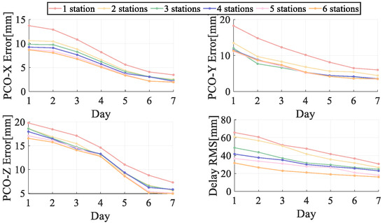 When the number of stations is fixed at three, extending the processing duration significantly enhances estimation accuracy, as shown in Table 10. From day 1 to day 7, estimation biases for all PCO components and equipment delay steadily decrease. During the first three days, the Y-direction PCO shows the most rapid improvement, while the X and Z directions exhibit more substantial gains from days 3 to 7, particularly the Z direction, whose bias decreases from 18.59 mm to 5.74 mm. The equipment delay estimate improves considerably within the first four days, with subsequent improvements tapering off, indicating that while longer observation periods improve observability, the marginal benefit diminishes beyond a certain point.