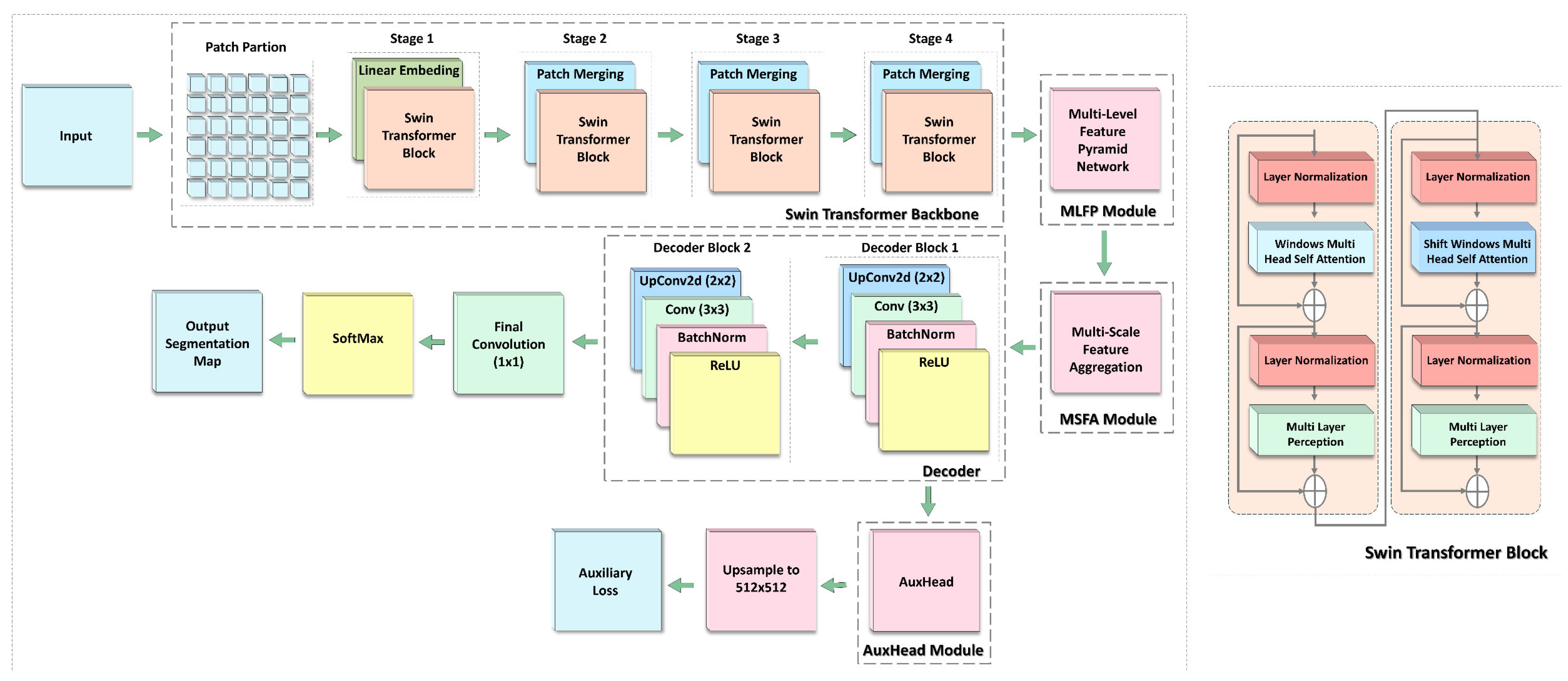 - Novel Architecture: We introduced a Swin Transformer-based network with three modules: MLFP fuses multi-level features, MSFA aggregates multi-scale context, and AuxHead provides auxiliary supervision to stabilize training. Together, they preserve spatial detail and improve building-boundary segmentation in VHR imagery.