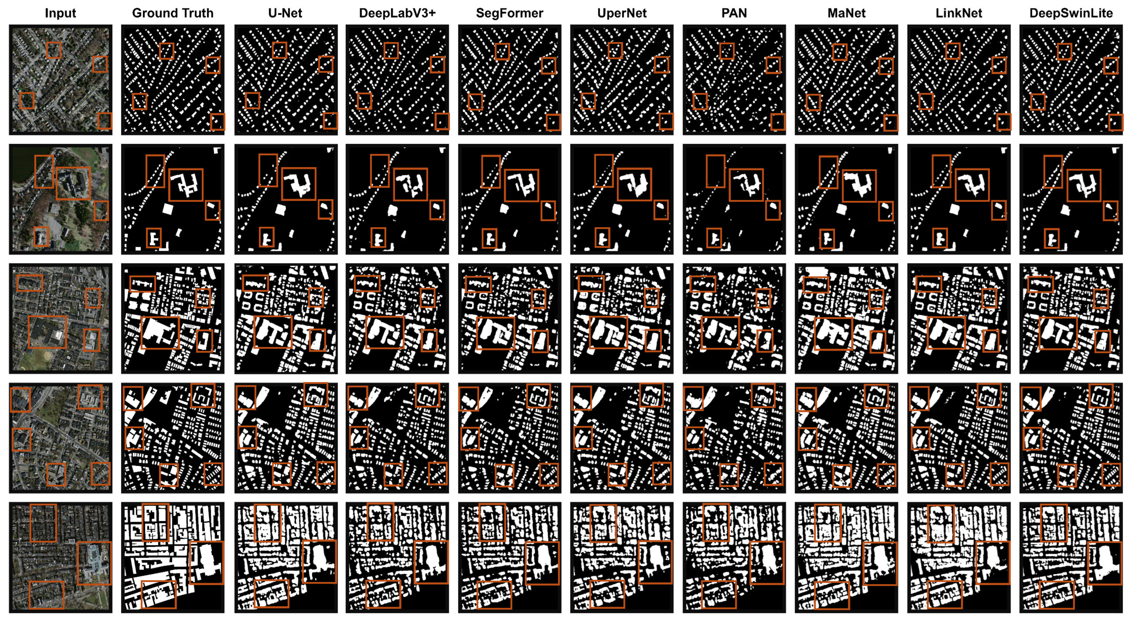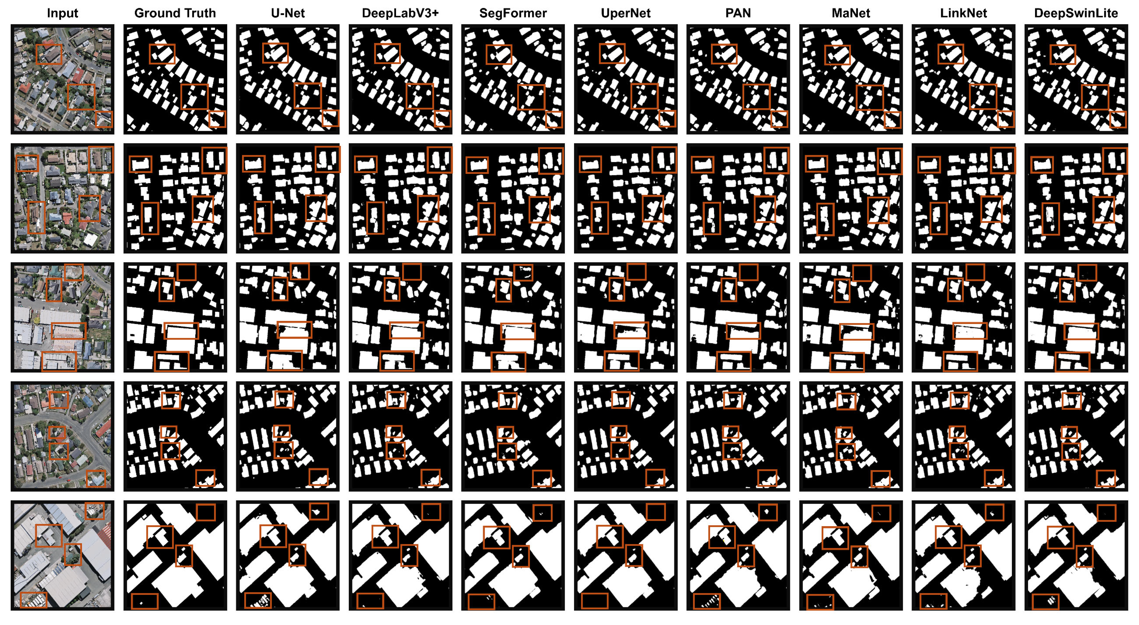- Comprehensive Benchmarking: We conducted DeepSwinLite against both classical baselines (U-Net, DeepLabV3+, SegFormer) and recent SOTA models (LiteST-Net, SCTM, MAFF-HRNet) on the Massachusetts and WHU datasets, considering both accuracy and computational efficiency (parameters, FLOPs).
