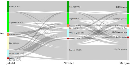 Figure 9 illustrates the transitions in crop types and LC across the three seasons of 2023: Jul–Oct, Nov–Feb, and Mar–Jun. In Figure 9a, the most significant crop dynamics occurred between the Jul–Oct period and the Nov–Feb period, with a transition from sugarcane to bare soil and subsequently from bare soil to sugarcane between the Nov–Feb period and the Mar–Jun period. In Figure 9b, the most notable transitions occurred from rice to bare soil from the Jul–Oct period and the Nov–Feb period, and from bare soil to sugarcane from the Nov–Feb period and the Mar–Jun period. This information regarding changes in crop types is invaluable for understanding crop rotation patterns.
