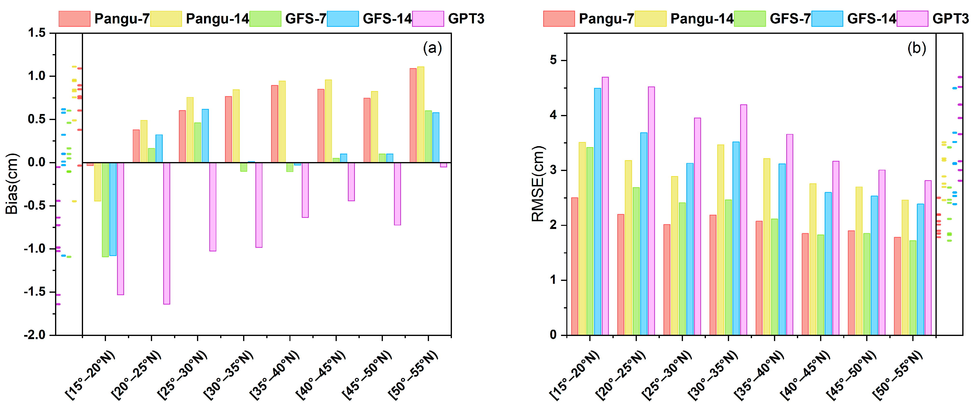 4.3. Accuracy Analysis of Different Latitude Belts and Different Height Ranges