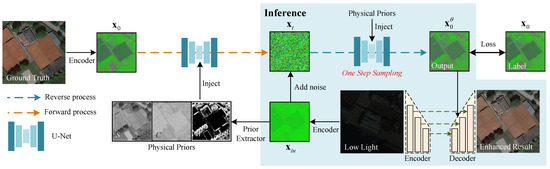 To address these issues, this study proposes an enhancement framework based on a lightweight encoder–decoder and a physical prior guided end-to-end single-step residual diffusion model. The lightweight encoder–decoder, specifically tailored for low-light remote sensing scenarios, reduces computational redundancy while preserving key image features, ensuring efficient mapping between the pixel space and the latent space. Under the guidance of physical priors, the end-to-end single-step residual diffusion model simplifies the enhancement process by eliminates the multi-step noise estimation step through end-to-end training, thereby accelerating the inference speed without sacrificing the quality. Meanwhile, the illumination-invariant priors impose necessary guidance on the generation process, alleviating the blurriness in generation caused by missing details under low-light conditions and ensuring the structural consistency of the enhanced results. Our main contributions are summarized as follows: