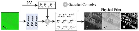 The Gaussian color model is used to estimate the spectral energy and its derivatives from RGB images, providing a basis for the calculation of illumination-invariant physical priors. As a bridge connecting RGB images and spectral energy features, it maps RGB channel values to variables related to spectral energy, such as the spectral energy , first-order spectral derivative , and second-order spectral derivative , through linear transformation, thereby supporting the derivation of subsequent illumination-invariant priors: S, C, and W. For the input RGB image, the Gaussian color model performs a linear transformation through a 3 × 3 matrix with the formula
