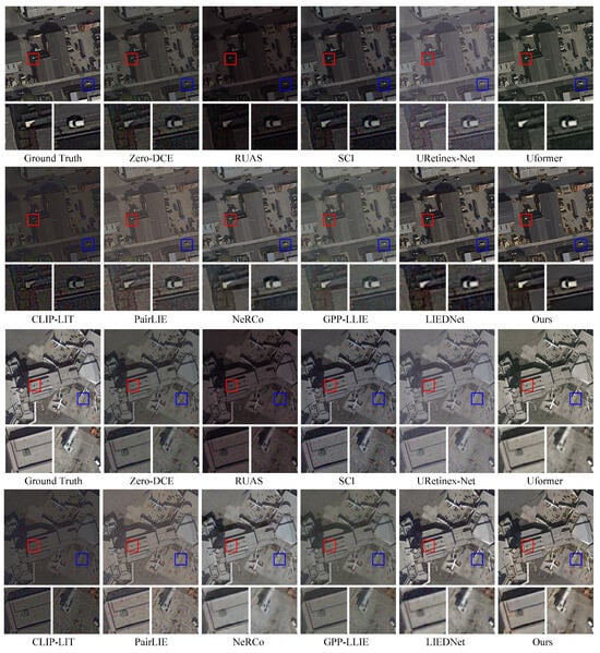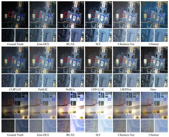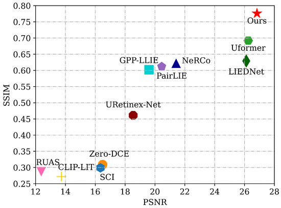 Comparisons with mainstream methods underscore the framework’s superiority in both quantitative metrics (e.g., PSNR and SSIM shown in Figure 11) and visual quality. However, it is important to note that the framework’s performance may vary in extreme low-light conditions, as the priors rely on at least minimal residual information to guide the enhancement. In addition, in some scenarios where there is a large gap between bright and dark areas, the model may experience partial overexposure. Future work could explore fixing these issues and extending this method to low-light enhancement of multispectral remote sensing images.