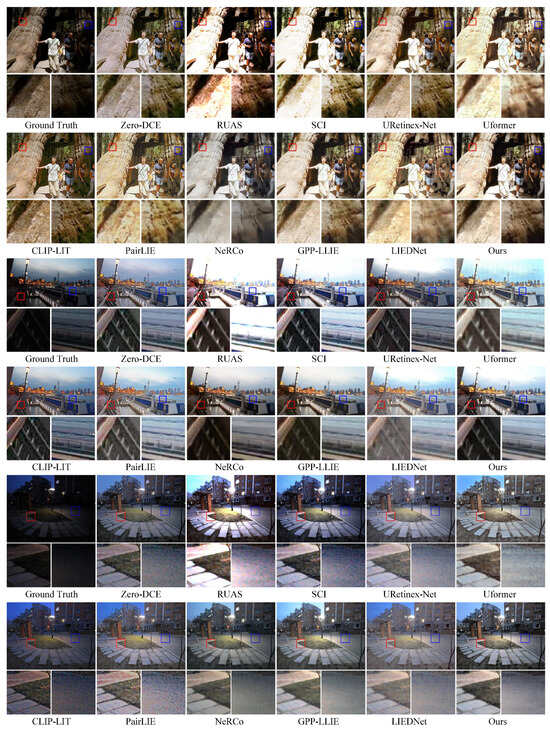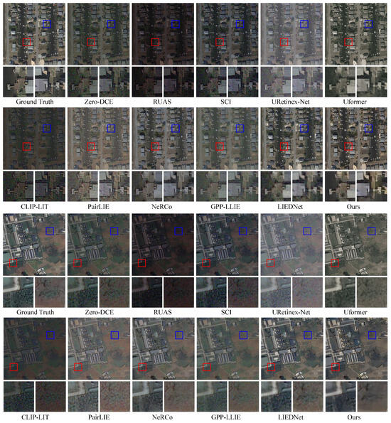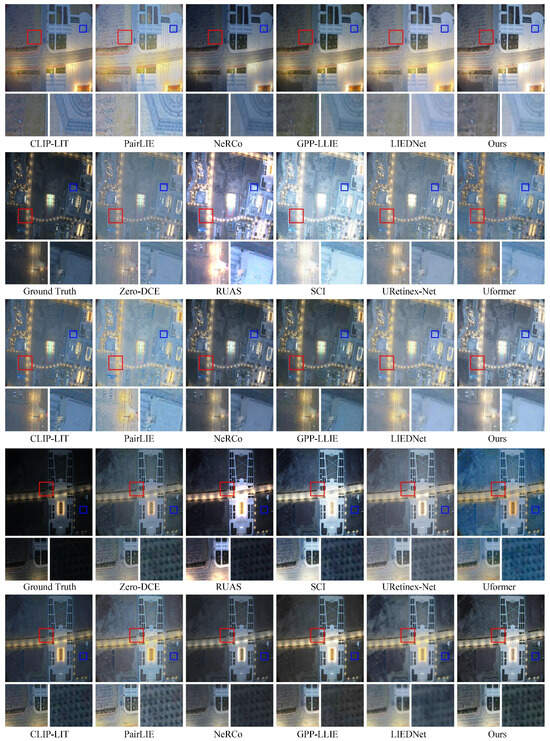 To further evaluate the generalization ability of the model for low-light images in different real scenarios, we additionally selected several well-recognized datasets for testing, including DICM [39], NPE [40], LIME [41], and LSRW [42]. The datasets used in the experiments cover both remote sensing and non-remote sensing fields, including natural outdoor scenes and typical indoor environments. Among them, non-remote sensing datasets (such as aerial sky images and low-light indoor scenes) can further verify the generalization performance of the algorithm.