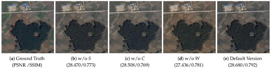 As shown in Table 7, the PSNRs of “w/o S” is 26.293, “w/o C” is 26.181, and “w/o W” is 25.805, all of which are lower than the default version (26.838). Their SSIM and LPIPS also show worse performances compared with the default. This demonstrates that each component of the physical priors plays a positive role in the model. The visual and metric comparisons on a single image are presented in Figure 10. The integration of these priors helps the model better conform to the physical characteristics of images during the enhancement process, thereby improving the overall quality of low-light remote sensing image enhancement.