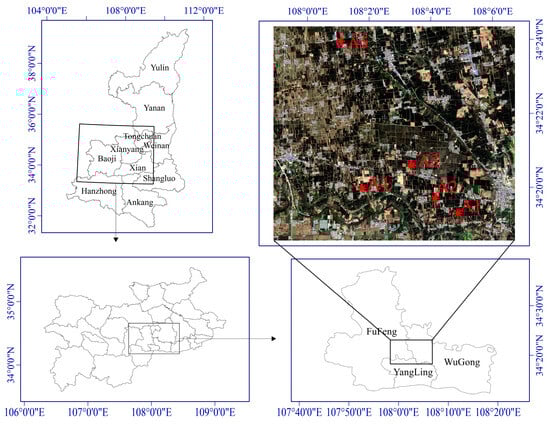 The study area is situated at the boundary between Wugong County (108°01′E–108°19′E, 34°12′N–34°26′N) and Fufeng County (107°45′E–108°03′E, 34°12′N–34°37′N) in Shaanxi Province, China. As shown in Figure 1, it is located in the western part of the Guanzhong Plain and is characterized mainly by loess terraces and Weihe River terraces. The region has a warm temperate, semi-humid continental monsoon climate with abundant sunlight and well-defined seasons. In Wugong County, the average annual precipitation is 633 mm, the mean temperature is 12.9 °C, and there are approximately 2095 h of sunshine annually. In Fufeng County, these values are 592 mm, 12.4 °C, and approximately 2134 h of sunshine annually.