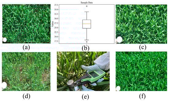 Schematic diagrams of partial sample collection in the study area and the boxplot of sample data distribution. Panels (a,c,d,f) show partial sampling locations. Panel (b) presents the boxplot of sample data distribution. Panel (e) displays the measurement process using the Dualex Scientific+ instrument.