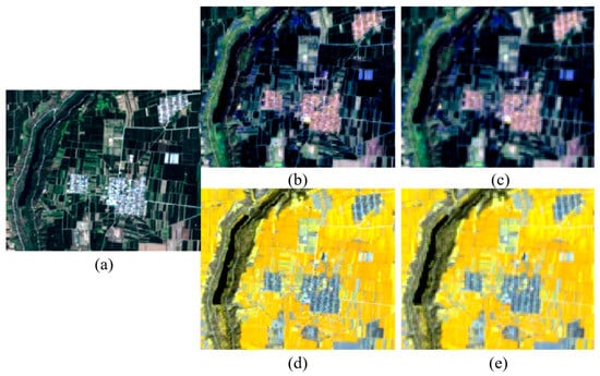 Comparison between original and Sen2Res-enhanced images. (a) Original 10 m true-color image with R/G/B = Band 4/Band 3/Band 2; (b,c) represent enhanced and original false-color images with R/G/B = Band 12/Band 11/Band 5, respectively; (d,e) represent enhanced and original false-color images with R/G/B = Band 8A/Band 6/Band 5, respectively.
