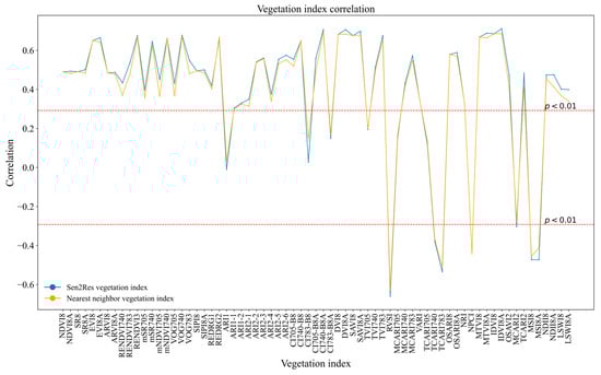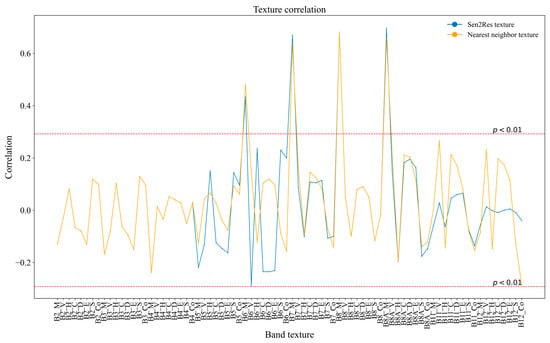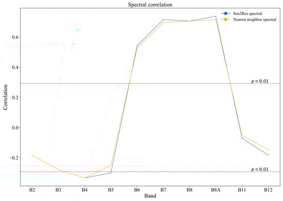 To evaluate the performance of Sen2Res reconstruction, information entropy and mean gradient were computed for each band of both Sen2Res and nearest neighbor resampled images. This study utilized ten Sentinel-2A bands: B2, B3, and B4 (blue, green, and red visible spectrum); B5, B6, and B7 (red-edge); B8 and B8A (near-infrared); and B11 and B12 (shortwave infrared).