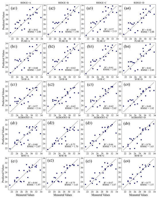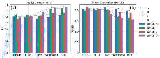 RIDGE [] is an enhanced form of linear regression that incorporates an L2 regularization term into the regression coefficients to address overfitting in linear models. PLSR [] is another adapted linear regression technique, primarily used to address multicollinearity issues. SVR [] maps input data into a high-dimensional space and seeks a hyperplane that best fits the data, ensuring that most data points fall within a defined margin near the plane. SVR offers several advantages, including strong noise resistance, global optimality, and effective handling of high-dimensional data. XGBOOST [] is a tree-based ensemble learning algorithm that belongs to the Boosting family and is characterized by high speed, accuracy, and adaptability to diverse data types. RFR [] is also a tree-based ensemble learning method built on the Bagging (Bootstrap Aggregating) approach. RFR can handle high dimensional data, is resistant to overfitting, estimates feature importance, and provides high prediction accuracy.