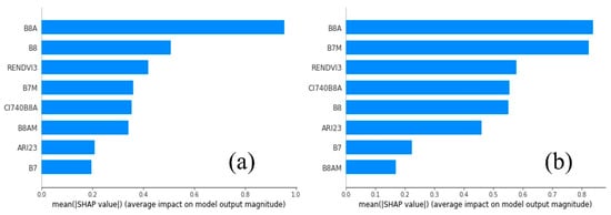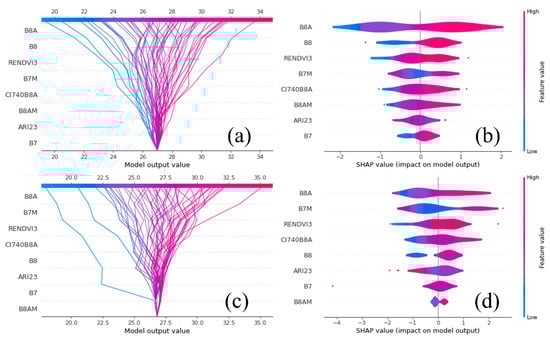 Interpretability has become a prominent area of research in the development of machine learning and artificial intelligence, with the Shapley value emerging as a powerful tool for explaining complex relationships between multivariate features and predictive models []. SHAP, a game theory-based approach, enables post hoc global and local interpretation of black-box models, thereby improving the transparency and reliability of model predictions and providing valuable insights for data collection and experimental design []. Due to its relatively recent adoption, only a limited number of studies have applied SHAP to interpret prediction models in crop monitoring.