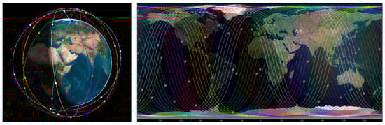 Previous studies have shown that a number of 60 LEO satellites enable LeGNSS POD to reach optimal accuracy, with sun-synchronous orbits providing better augmentation effects than polar orbits []. To evaluate the contribution of LEO ISLs observations to joint POD, a Walker 60/10/1 LEO constellation was designed with an orbital altitude of 1500 km and an inclination of 97°. The detailed nominal parameters for BDS-3 and the LEO constellation are listed in Table 1. Table 2 presents the orbital plane distribution of satellites in the Walker-Delta (60/10/1) constellation at the initial epoch. The complex dynamic models used for the LEO constellation configuration are summarized in Table 3. The 3D and 2D views of the designed LEO constellation are shown in Figure 1.