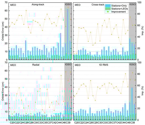 The regional monitoring network often provides insufficient observation arc for MEO satellites within a single day, resulting in inadequate orbital accuracy. Typically, three days of accumulated observation arcs are required to achieve decimeter-level POD accuracy. This requirement increases the difficulty of independently operating and maintaining the BDS-3 system. Fortunately, LEO satellites can address this deficiency by enabling sufficient tracking of MEO satellite observation arcs within a single day, effectively improving BDS-3 POD accuracy. Based on the strategy described in Section 3.2, BDS-3 POD results were derived using only regional monitoring stations. Joint POD results were also obtained after incorporating LEO onboard BDS-3 observations, and their average accuracies were compared.