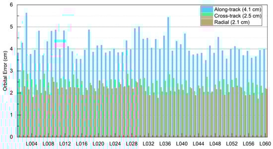 Since LEO satellites are expected to provide navigation services in the future, their orbital accuracy is also critical. Figure 5 shows the average orbital accuracy of the LEO satellites in the along-track, cross-track, and radial directions. As shown, the along-track component exhibited the largest orbital error, with an average of 4.1 cm. This is likely due to the along-track components aligning with the satellite’s motion, where the largest non-conservative perturbing force, atmospheric drag, fully impacts this component, resulting in the greatest acceleration error. The cross-track and radial components were smaller and relatively close, with average errors of 2.5 cm and 2.1 cm, respectively.
