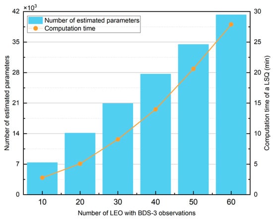 Figure 6 shows the number of estimated parameters (NEP) and the computation time of a single BLSQ (CT-BLSQ) for different numbers of LEO-BDS3 satellites. It can be observed that as the number of LEO-BDS3 satellites increases, the NEP grows linearly. This is because each additional LEO-BDS3 satellite introduces a substantial number of parameters. It can also be seen that due to the linear increase in NEP, the CT-LSQ shows a dramatic rise. Table 6 provides details of the NEP and CT-BLSQ, showing that for every additional 10 LEO-BDS3 satellites, the NEP increases by an average of 6780 parameters. Among these, 2880 parameters are LEO receiver clock offsets (which are not required for POD using ISL data), while the rest are ambiguity parameters. This results in a sharp increase in computation time, rising from only 3.6 min with 10 LEO-BDS3 satellites to 27 min with 60 LEO-BDS3 satellites, corresponding to a 650% increase.