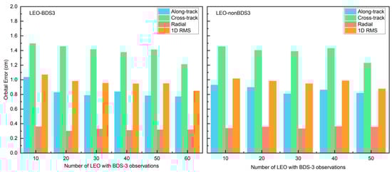 Orbital accuracy of LEO-BDS3 and LEO-nonBDS3 satellites under different numbers of LEO-BDS3 satellites.