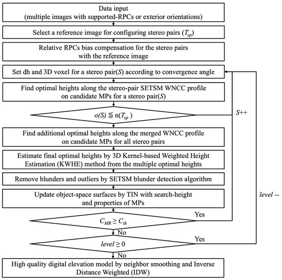 The workflow for the developed SETSM multiple-pair matching procedure (SETSM MMP) is shown in Figure 1. SETSM MMP uses the stereopair SETSM strategies of pyramid-level processing and the 3D voxel structure. The 3D voxel is defined by the height increment (dh) and the planimetric, object–space coordinate of the MPs, as defined by the specified output DSM resolution, DSM boundary, and pyramid level. The dh of each stereopair is independently determined based on the stereopair geometry. Similarities between features in a stereopair are measured using WNCC combined with GNCC and UNCC, estimated by the modified keypoint descriptor of the SIFT. As in the single stereopair SETSM algorithm, the optimal height at each MP is determined from the WNCC profile and the updated threshold of WNCCth along the VLL. In addition to the optimal heights of each stereopair, SETSM MMP utilizes supplemental optimal heights derived from merged WNCC profiles with all the stereopairs. A final optimal height is estimated by a novel object-based 3D Kernel-based Weighted Height Estimation (KWHE) from all the optimal heights at each MP. All subsequent procedures in the algorithm, including the blunder and outlier detection, object–space surface update, and output DSM generation, are the same as the single stereopair SETSM algorithm with minor modifications.