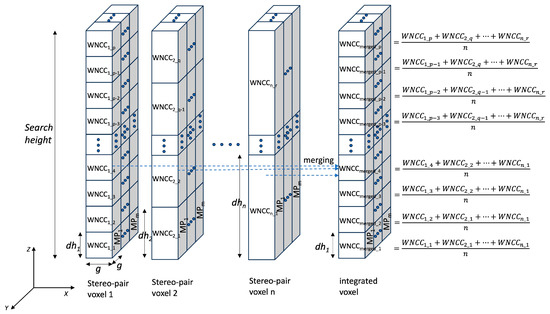 For supplemental observations, SETSM MMP adopts merged WNCC profiles to estimate smooth optimal heights from all the stereopairs. The minimum dh among all the stereopairs for constructing integrated 3D voxels to calculate the merged WNCC is selected to maintain the best height accuracy. Each WNCC in a stereopair 3D voxel is assigned to a corresponding position in the integrated 3D voxel. The merged WNCC is then calculated by averaging all the WNCCs into an integrated 3D voxel, as shown in Figure 3.