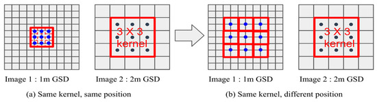 Pixel-to-pixel similarity measurement with GSD difference. Red lines are the kernel locations with 3-by-3 kernels, and blue dots are the corresponding pixel locations to measure similarity. Pixel values of the blue locations are resampled by bilinear interpolation from original resolution patches.