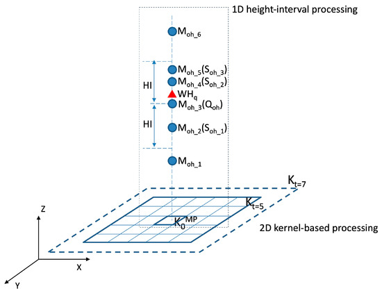 Illustration of the 3D Kernel-based Weighted Height Estimation (KWHE) consisting of 1D processing in the vertical direction at each MP and 2D kernel-based processing on the xy plane. HI is the height interval, Mohs are the multiple optimal heights, Qoh is the query optimal height for calculating a weighted optimal height (WHq), and Soh are the selected optimal heights within the HI for the query optimal height (Qoh). KtMP defines the 2D kernel with t size centered around a target MP (K0MP).