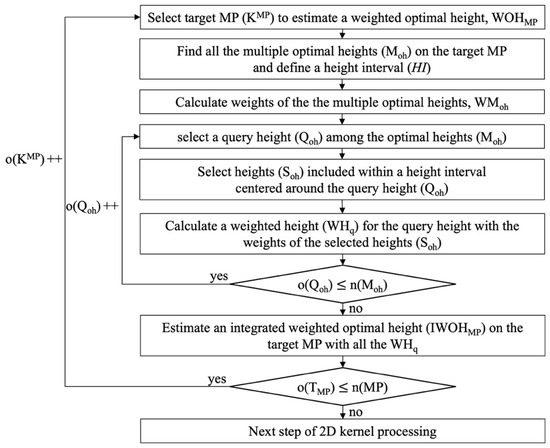 Two-dimensional kernel-based processing for estimating final weighted optimal heights. o(KMP) is the order of target MP (KMP).