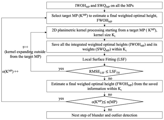 After estimating all the IWOHMP and SWQMP, the 2D kernel-based processing determines a final weighted optimal height, FWOHMP, of a target MP (KMP) as shown in Figure 7. This determination is based on the neighboring 3D information selected within a 2D kernel as illustrated in Figure 5. The 3D information, including X and Y coordinates of MPs and the IWOHMPs, is used to reconstruct 3D surfaces through the LSF algorithm [27]. The extent of the neighborhood area centered around the KMP is determined by the 2D kernel, which is expanded outward from the KMP based on root mean square error (RMSELSF) determined from the LSF. A threshold LSFTH for RMSELSF is directly connected to a level of noise and roughness reduction on surfaces and is defined by considering the expected height accuracy of MP: