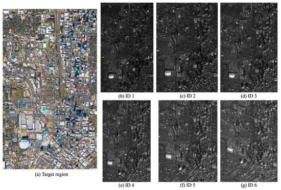 Test target region. The complete target region (a) includes Atlanta’s tech square and hotel district. Image © 2025, Google. In this figure, (b–g) depict the enlarged images of the target region from the original images. Imagery © 2009, MAXAR, Inc.