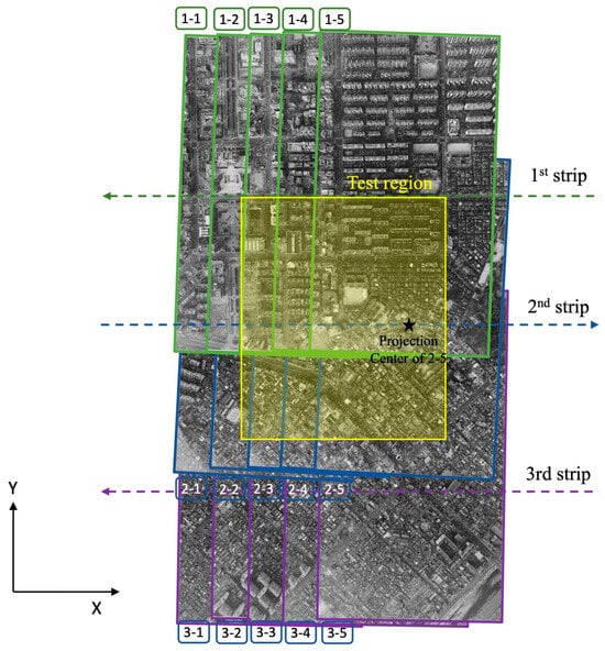 Intergraph Z/I Imaging Digital Mapping Camera (DMC) captured five vertical images along three strips with 80% endlap in the x-direction and 60% sidelap in the y-direction (Figure 10). The DMC system consists of four high-resolution and four multispectral camera heads, producing a composite image with a size of 7680 by 13,824 pixels [28]. The images have a consistent GSD of 0.1 m. Relief displacement and occlusions are oriented radially from the projection center of the image, with their effects significantly amplified by the lower altitude of the aircraft compared to the satellite imagery.